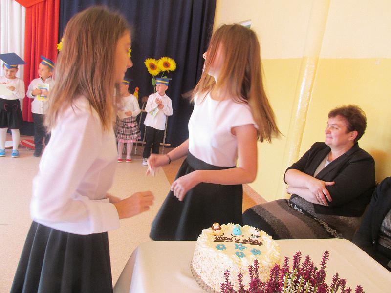 Sympatycznym zakończeniem tej wyjątkowej uroczystości był słodki poczęstunek w postaci tortu podarowanego pierwszakom od społeczności szkolnej, który został skonsumowany wraz z innymi pysznościami przygotowanymi przez Radę Rodziców.