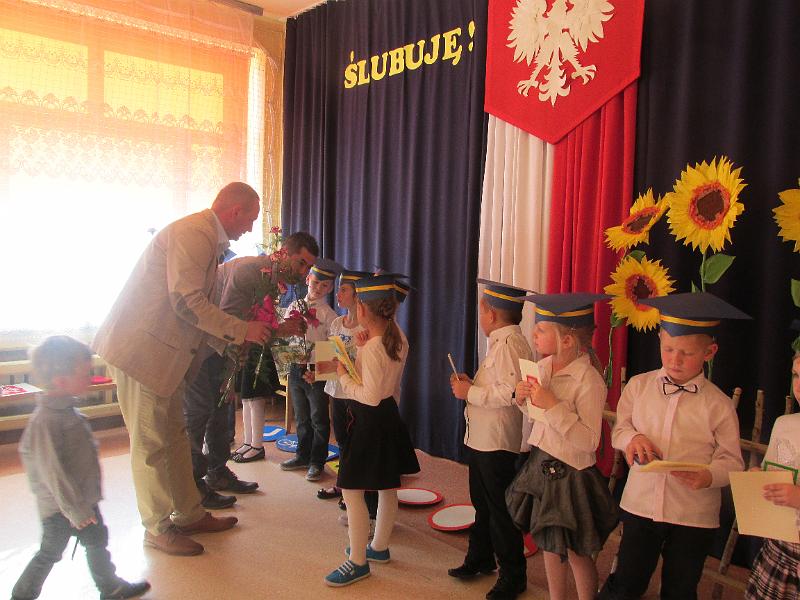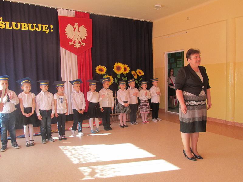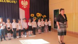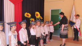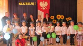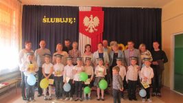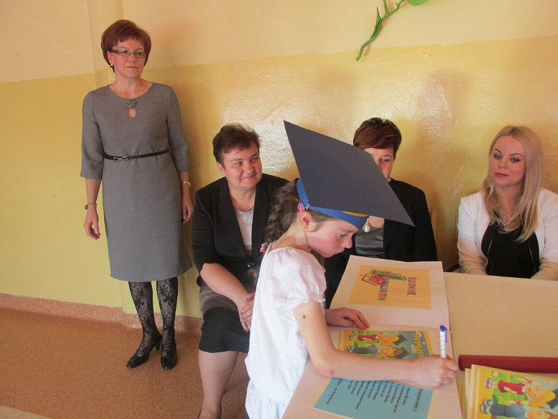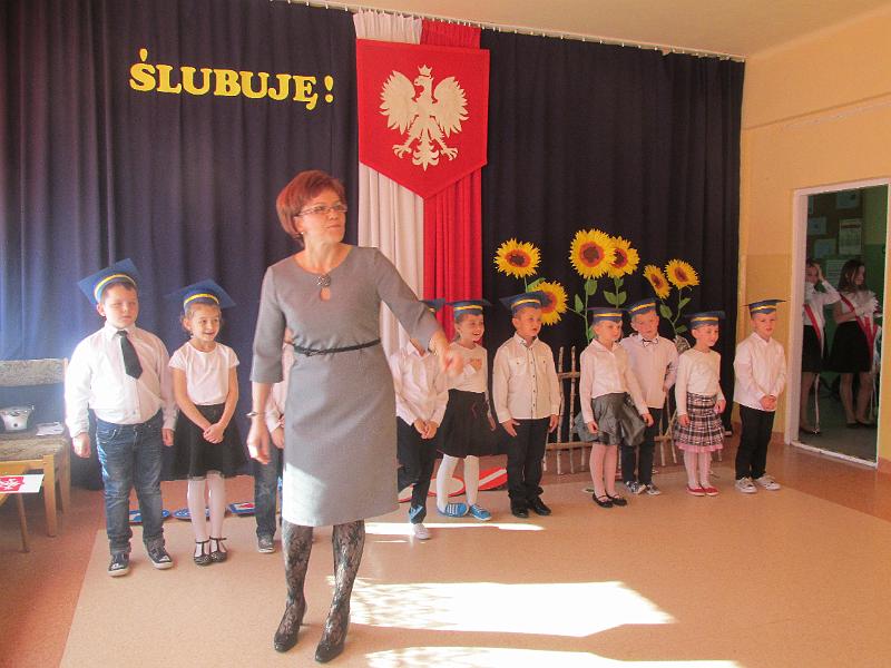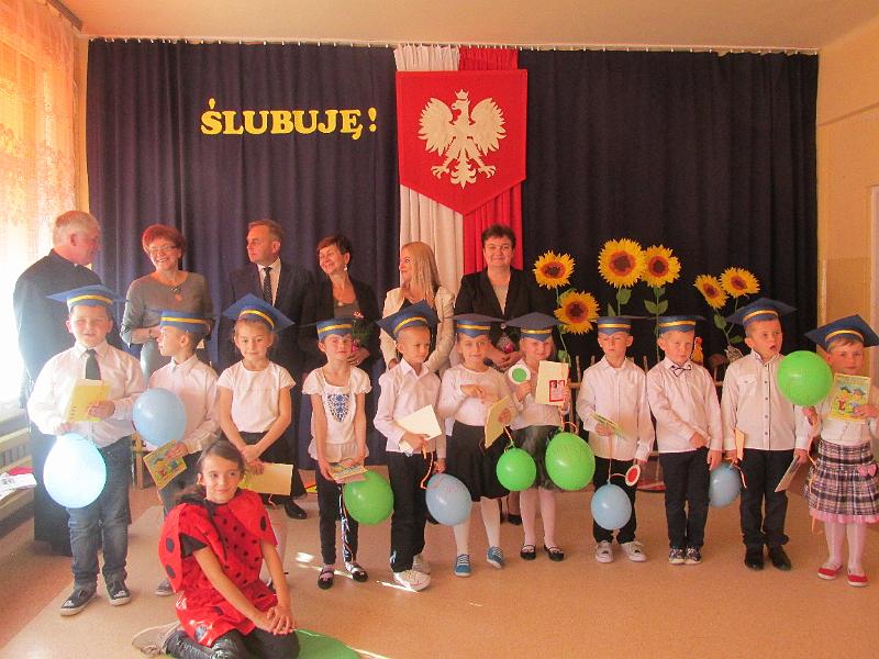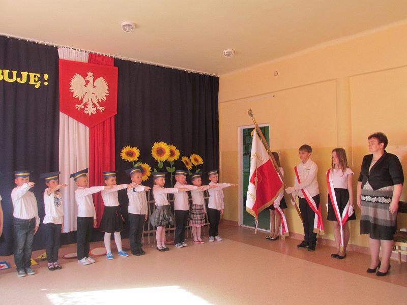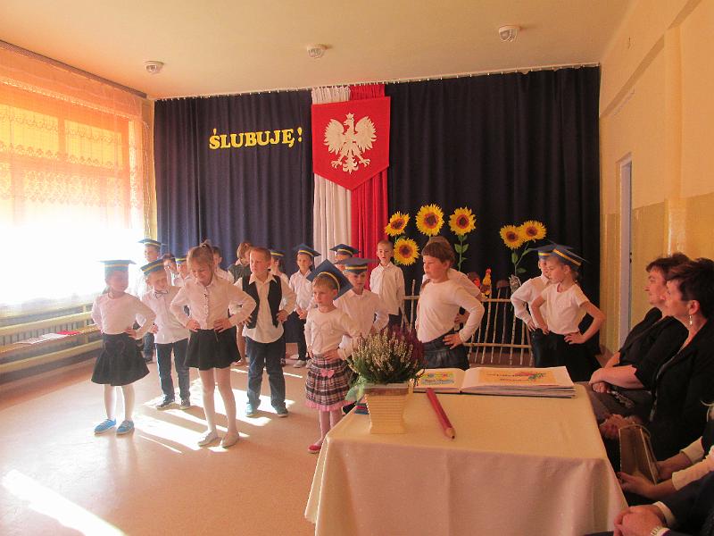 Następnie został wprowadzony sztandar szkoły. Po odśpiewaniu hymnu państwowego uczniowie w obecności zaproszonych gości, rodziców i Grona Pedagogicznego złożyli uroczyste ślubowanie, po czym pani dyrektor Wiesława Sobol pasowała każdego z nich na ucznia szkoły, symbolicznie uderzając go w ramię ołówkiem. W dalszej części uroczystości pierwszoklasiści wpisywali się do Kroniki Szkoły, a wychowawczyni – pani Maria Warchoł oraz pani dyrektor wręczały im pamiątkowe dyplomy i legitymacje szkolne.