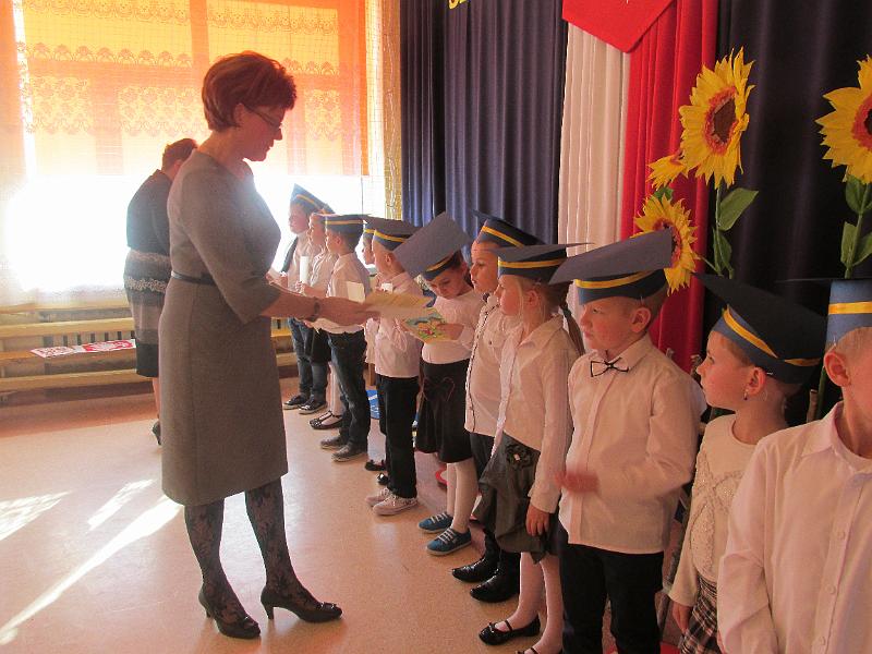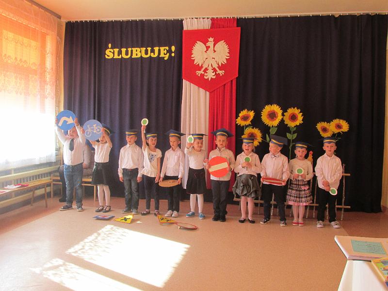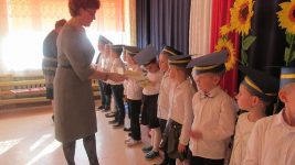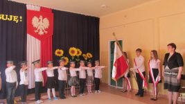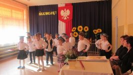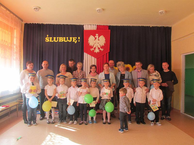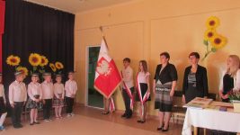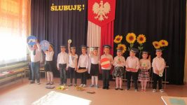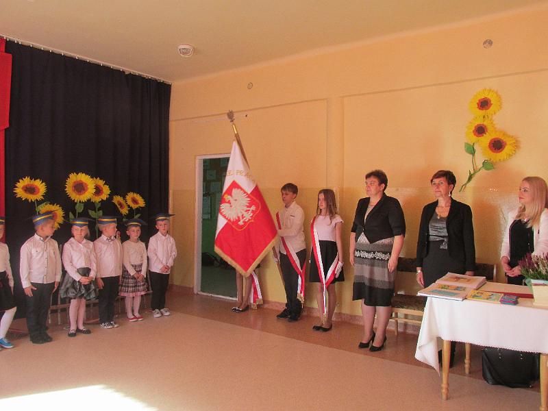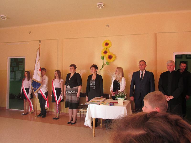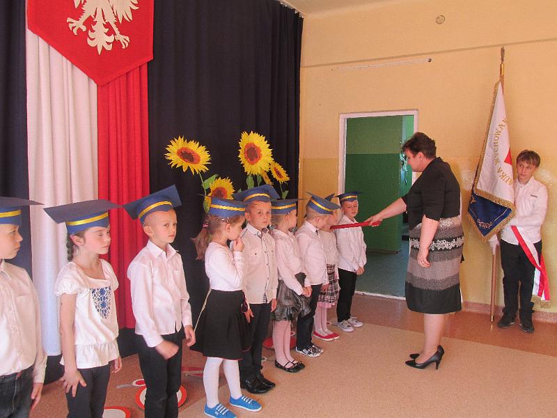 Następnie został wprowadzony sztandar szkoły. Po odśpiewaniu hymnu państwowego uczniowie w obecności zaproszonych gości, rodziców i Grona Pedagogicznego złożyli uroczyste ślubowanie, po czym pani dyrektor Wiesława Sobol pasowała każdego z nich na ucznia szkoły, symbolicznie uderzając go w ramię ołówkiem. W dalszej części uroczystości pierwszoklasiści wpisywali się do Kroniki Szkoły, a wychowawczyni – pani Maria Warchoł oraz pani dyrektor wręczały im pamiątkowe dyplomy i legitymacje szkolne.