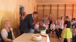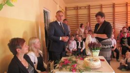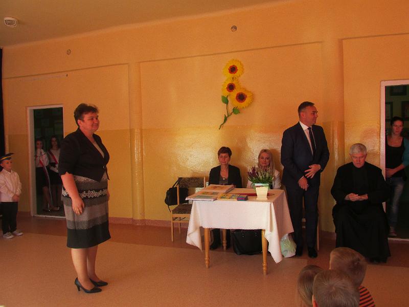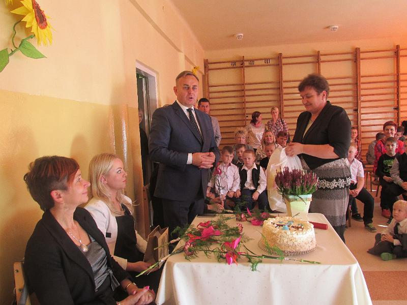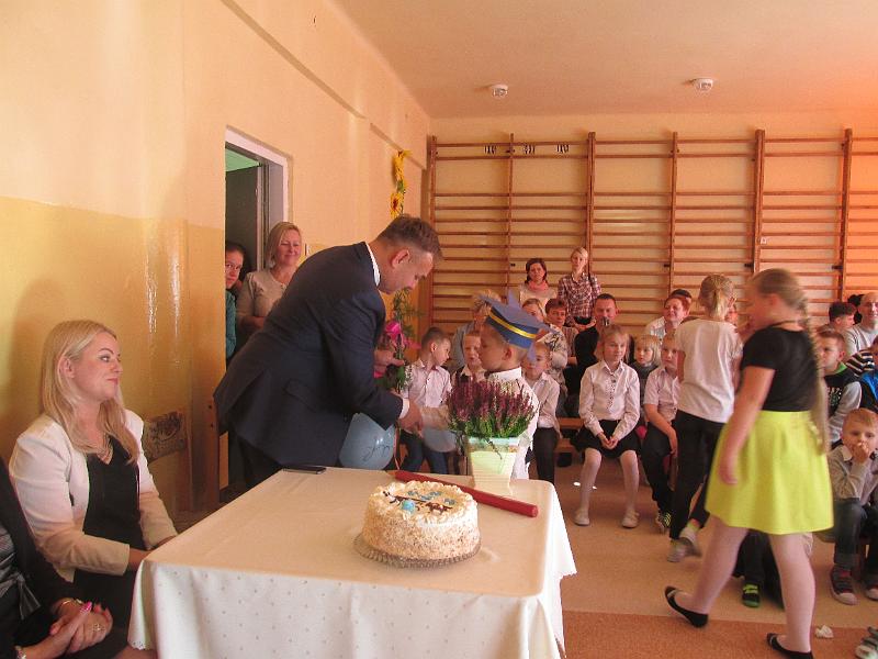 Jako drugi przemówił wójt gminy Jedlnia Letnisko, pan Piotr Leśnowolski, który pogratulował dzieciom włączenia do społeczności uczniowskiej. Zwrócił też uwagę, że jest to placówka przyjazna i cały czas rozwijająca się. Wyraził nadzieję, że kolejne tego typu uroczystości będą odbywać się już w nowowybudowanej sali gimnastycznej. Życzył pierwszakom, żeby potrafiły być uczniami godnie reprezentującymi szkołę, żeby czuły się w niej jak w domu, żeby właśnie tu zapoczątkowały się nowe przyjaźnie. Pan wójt pogratulował także rodzicom uczniów klasy pierwszej i podziękował nauczycielom za trud wkładany w kształtowanie postaw młodego pokolenia. Mówił: „To jest najważniejszy moment w życiu człowieka – szkoła podstawowa, gdzie kształtuje się postawy młodych ludzi. Jak społeczeństwo będzie ukształtowane, takie będzie potem społeczeństwo dorosłe, takie będzie później decyzje podejmowało, tak będzie kochało ojczyznę, takim będzie patriotą”. Zwracając się zaś do rodziców życzył im, aby mieli jak najmniej problemów z wychowaniem swoich dzieci, aby rozwijały się w duchu patriotycznym i miłości do ojczyzny. Nie obyło się również bez przekazania uczniom drobnego upominku w postaci sprzętu sportowego, zakupionego z myślą o rozgrywkach na nowej sali gimnastycznej.