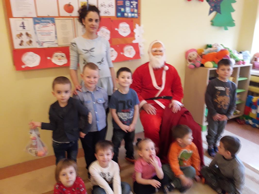 Ciężkie kroki i dźwięk dzwoneczków zapowiadały, że zbliża się tak długo oczekiwany Gość. Nagle w drzwiach ukazał się św. Mikołaj z siwą brodą i workiem prezentów. Przedszkolaki z radością przywitały Gościa piosenką Witaj św. Mikołaju”. Zapewniając o swojej grzeczności.