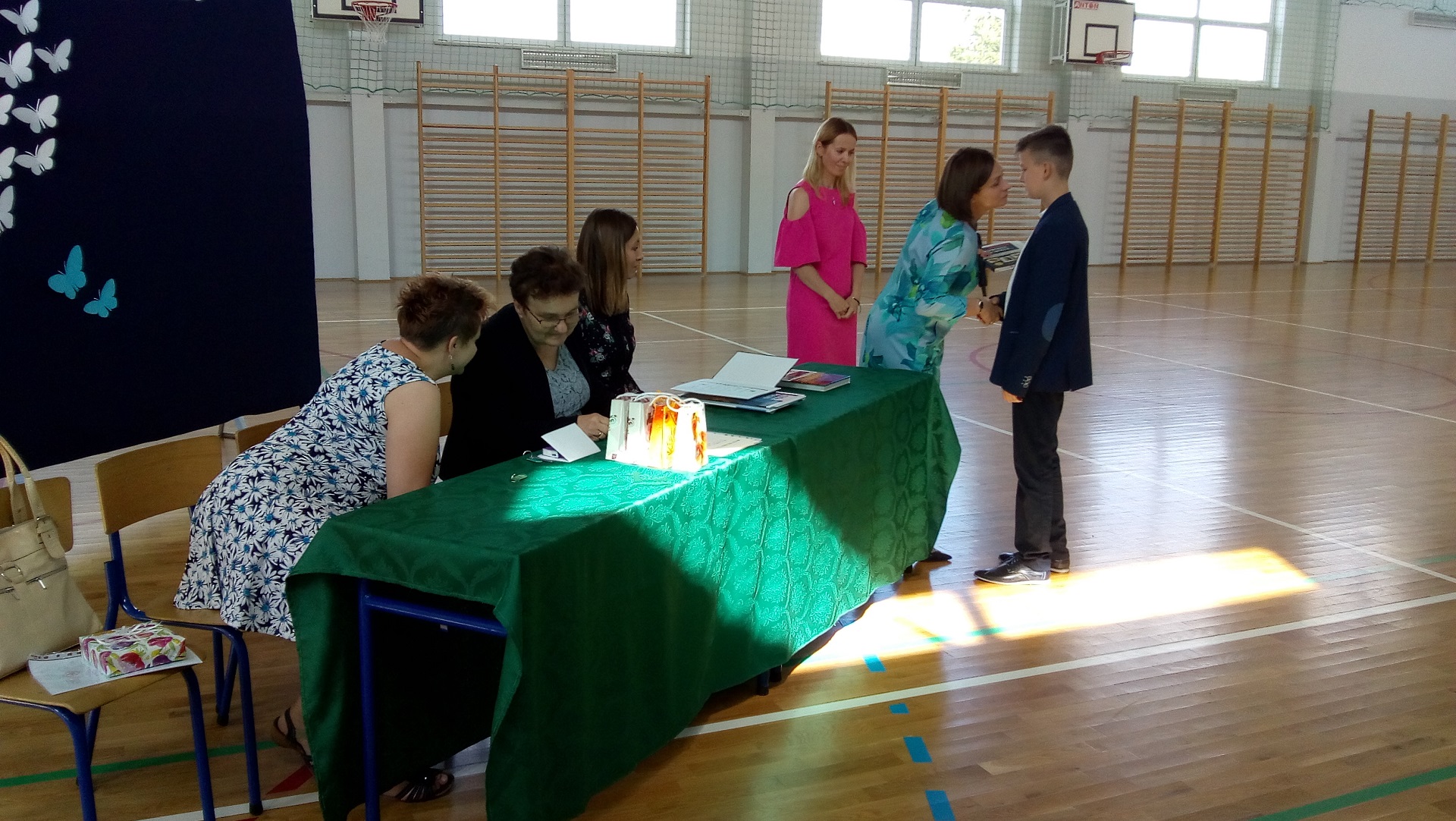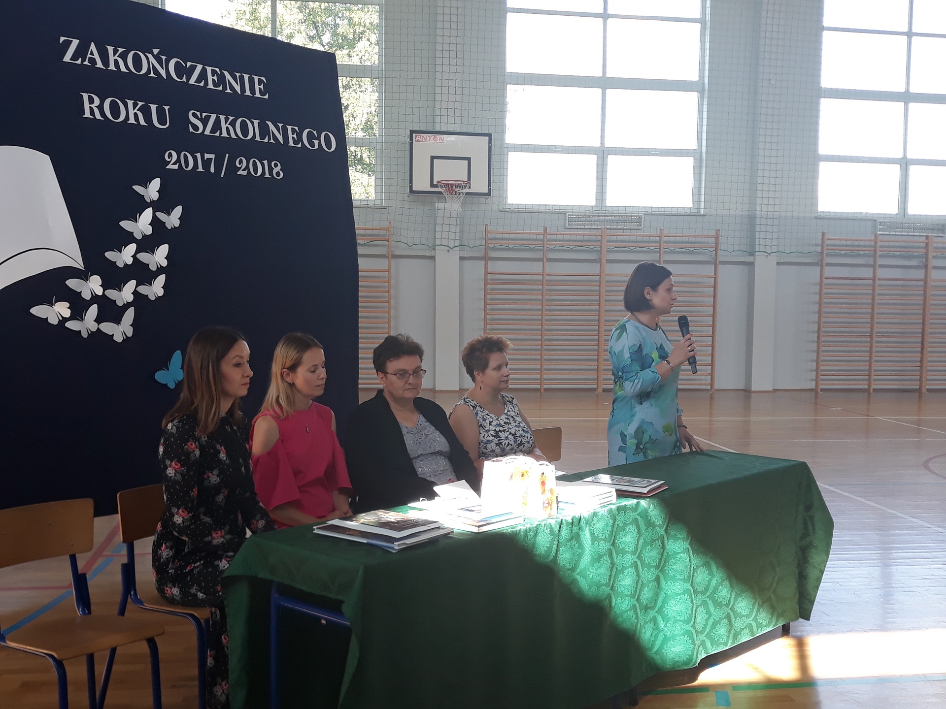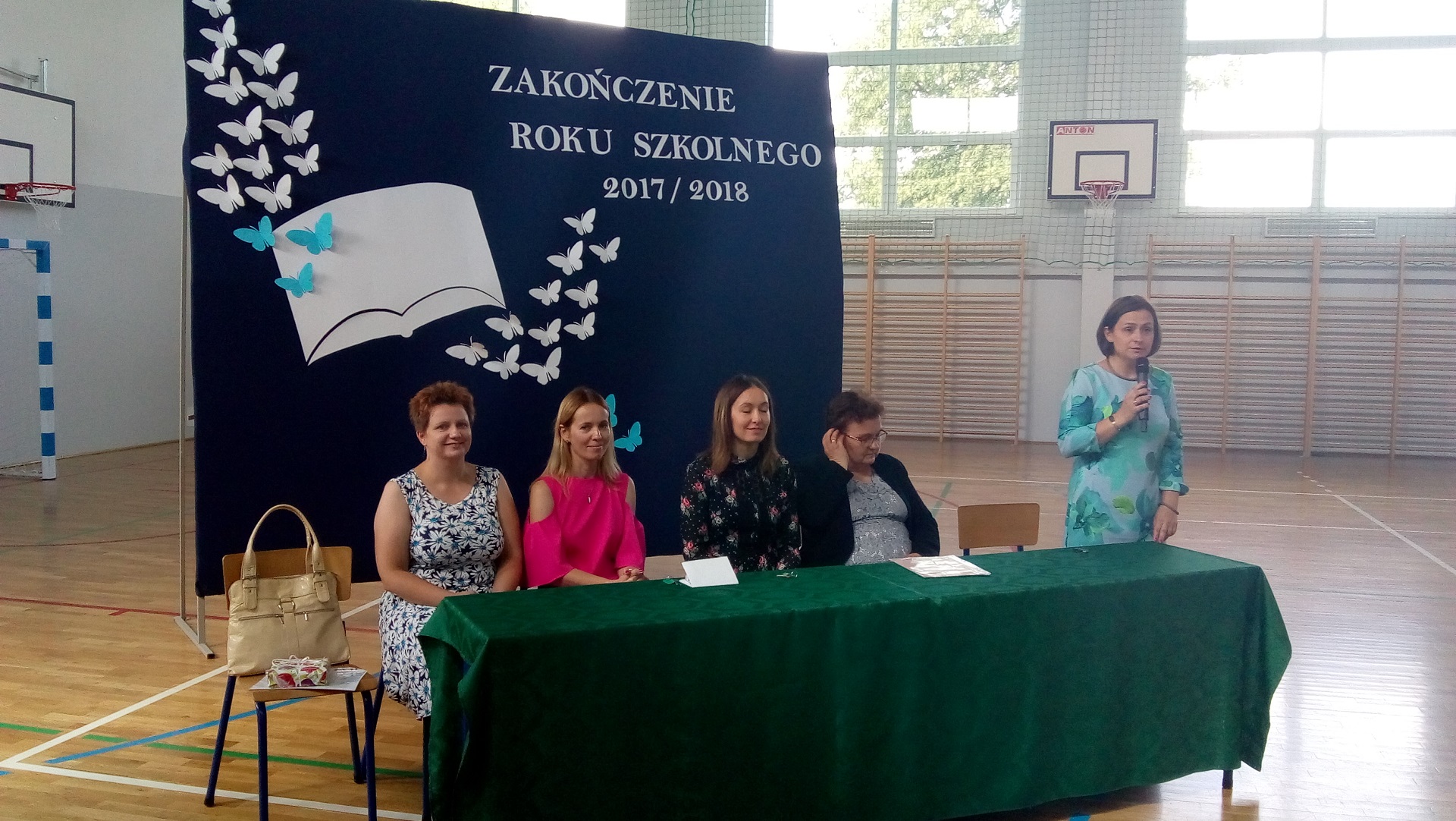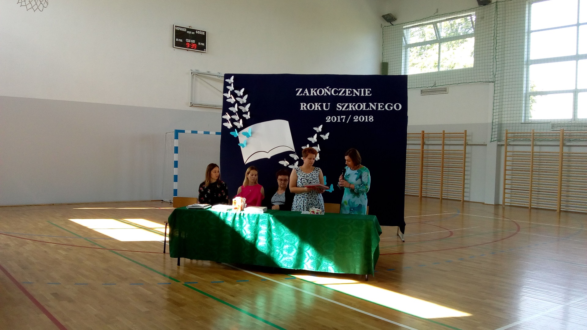 Dnia 22 czerwca odbyło się zakończenie roku szkolnego 2017/2018. O godz. 8.00 społeczność szkolna uczestniczyła we mszy świętej, a następnie w uroczystości na hali sportowej. Na uroczysty apel przybyli nauczyciele na czele z panią dyrektor Małgorzatą Hantz, ks. proboszcz Krzysztof Cielniak, uczniowie, ich rodzice. Uroczystość rozpoczęto wprowadzeniem sztandaru szkoły. Po odśpiewaniu hymnu narodowego i hymnu szkoły pani dyrektor powitała wszystkich zebranych i krótko podsumowała minione miesiące nauki. Następnie najzdolniejsi uczniowie naszej szkoły oprócz świadectw z czerwonym paskiem otrzymali również nagrody książkowe. W czasie tej uroczystości wyróżnieni zostali także najlepsi czytelnicy oraz laureaci szkolnego konkursu matematycznego.