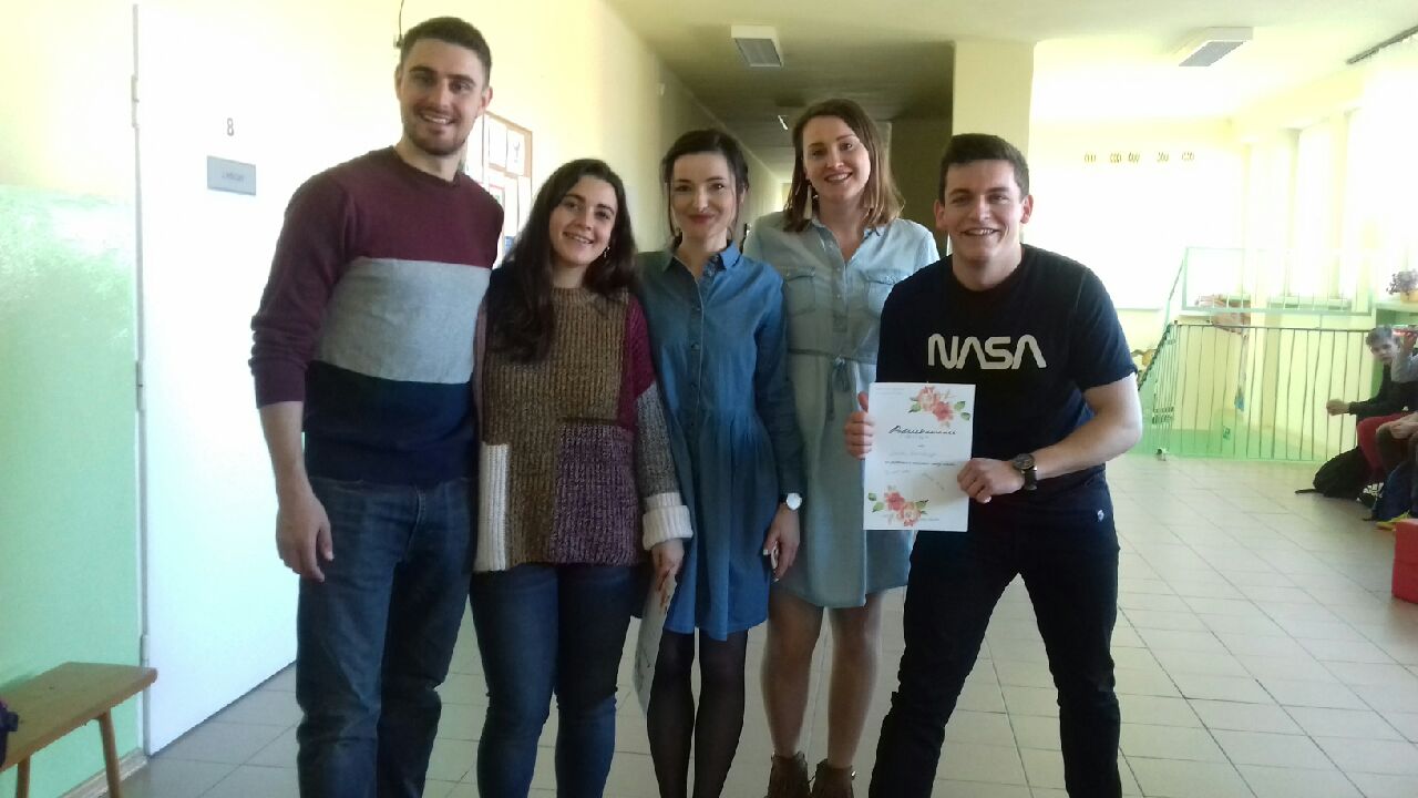 W dniu 02.04.19 uczniowie mieli okazję spotkać się z hiszpańskimi wolontariuszami stowarzyszenia Arka. Przedstawiciele stowarzyszenia pojawili się w naszej szkole po raz drugi, w ramach kontynuacji współpracy z zeszłego roku. Dla naszych uczniów była to okazja do zdobycia ciekawej wiedzy odnośnie historii, kultury oraz bieżących wydarzeń w Hiszpanii. Uczniowie mieli możliwość porozmawiać po angielsku, a także poznać kilka słów po hiszpańsku i portugalsku. Ciekawym elementem okazały się warsztaty z tańca flamenco, z którego chętnie skorzystali chłopcy z klasy ósmej. Spotkanie okazało się cennym doświadczeniem, dzięki któremu dzieci mogły poznać kulturę obcych krajów.
